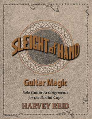 The first ever published and for decades the only book of guitar arrangements for partial capo, by national guitar champion and acoustic string wizard HARVEY REID. First written in 1983, and expanded later. Mostly traditional and classical, mostly fingerstyle, though there are a couple interesting flatpicking arrangements including "Devil's Dream" and "Sally Goodin'." Fiddle tunes, blues, classical, and some well-known folk melodies like "Scarborough Fair" and "Shenandoah," plus a couple Reid originals, including his debut work for the partial capo in Esus, "Suite For the Duchess" from his legendary solo CD Solo Guitar Sketchbook Written in TAB and standard notation, suitable for intermediate to advanced players. this book shows you how the partial capo changes the rules of what is possible on the guitar. Most tunes use standard tuning, though Reid's ingenious arrangement of Beethoven's Fur Elise is worth the price of the book. It is played in an open tuning with the partial capo, and allows a note-for-note way to play the piano piece, with an amazing number of open strings. There is no other way to play this piece without changing some notes. BUY THE BOOK FROM US Includes: Suite: For the Duchess and Für Elise, Scarborough Fair, Minuet in Dm, Flowers of Edinburgh, Simple Gifts, Sally Goodin‘, Irish Washerwoman, Pavanne, Minuet in Dm, Red-Haired Boy, June Apple, Jesu Joy of Man's Desiring, Devil's Dream, Sally Goodin', Scherzo, Shenandoah, Greensleeves, Sailor's Hornpipe, Fisher's Hornpipe Free sample PDF of "Devil's Dream" Free sample PDF of "E-Modal Boogie"